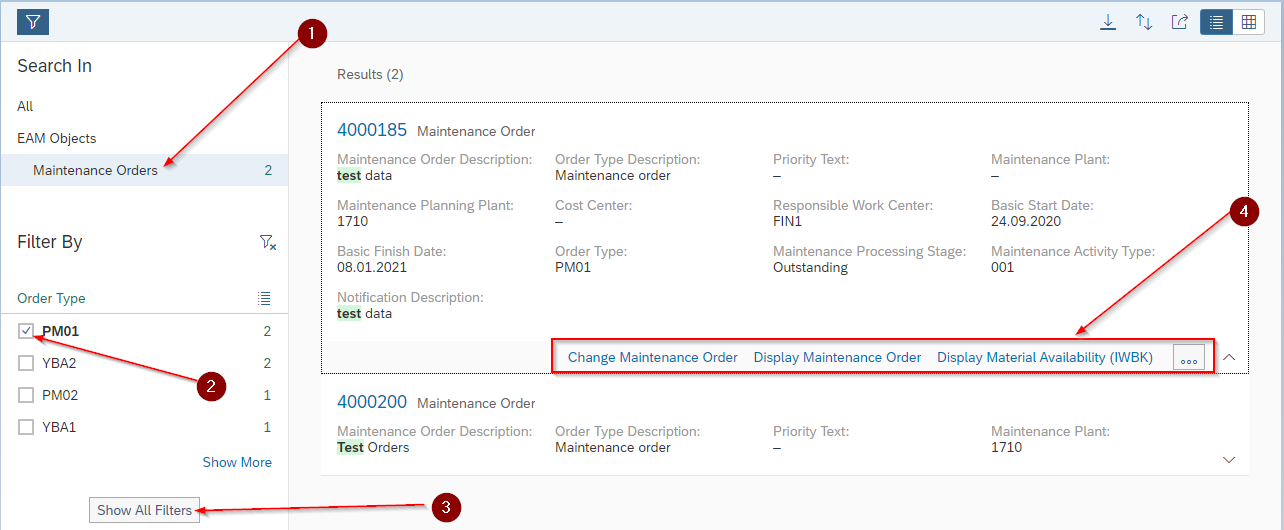 On the left side, you can then narrow the search by object type (1) or even more with other filters (2). There is a vast number of filters that are working out-of-the-box (3). From the details screen, you can drill down either to Fiori Apps, backend transactions, and more (4).